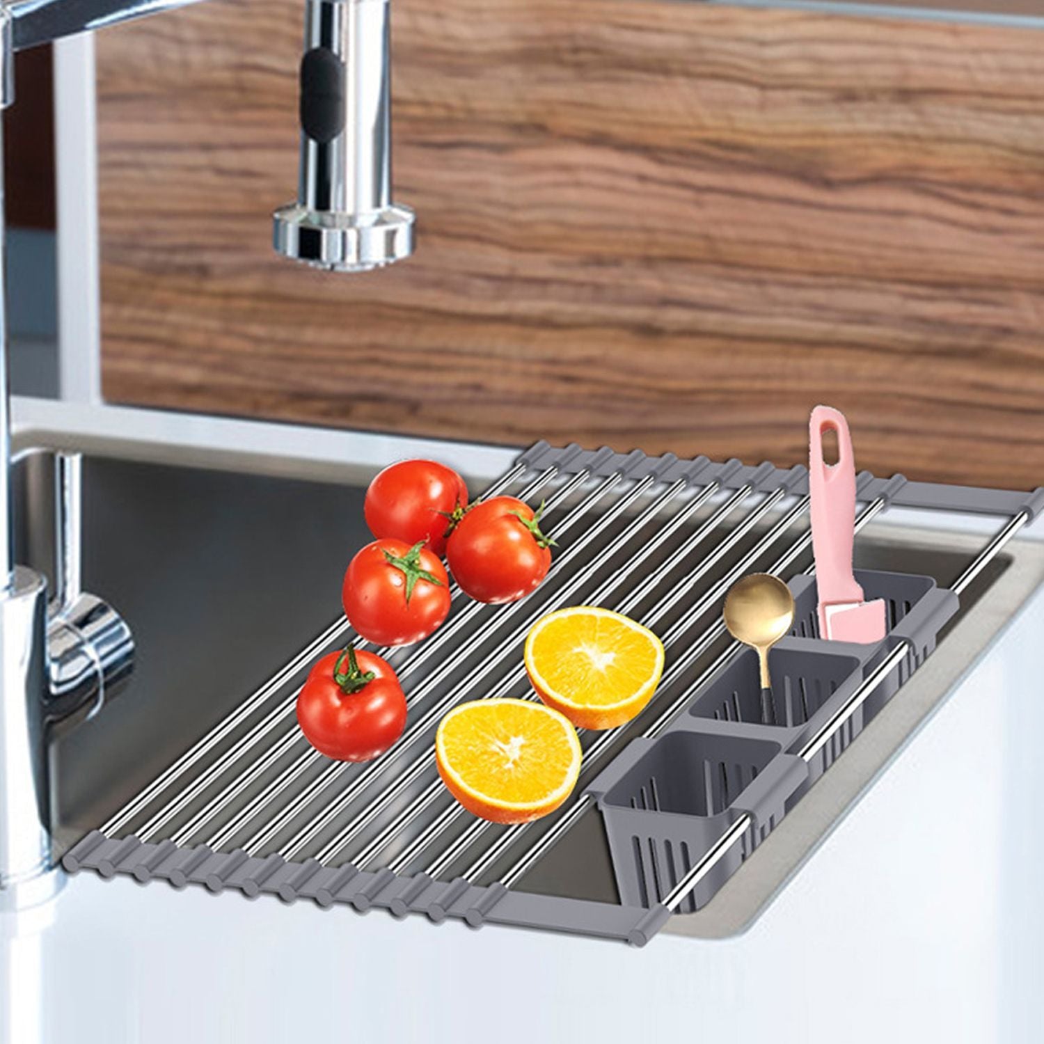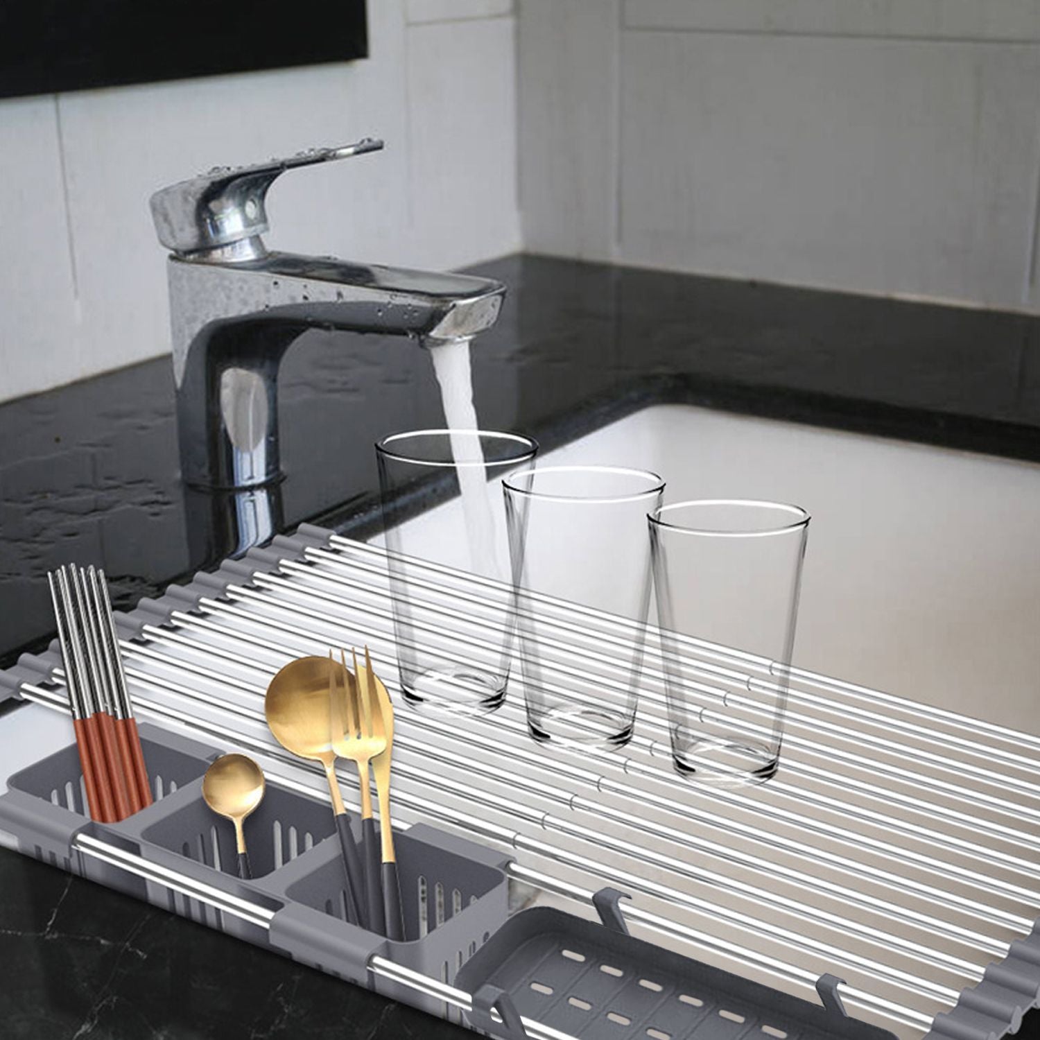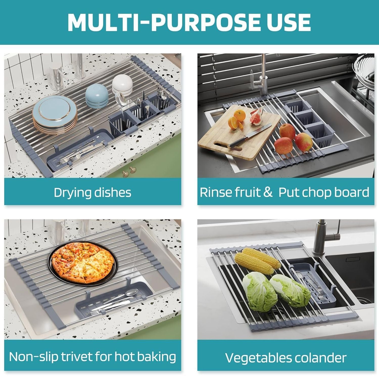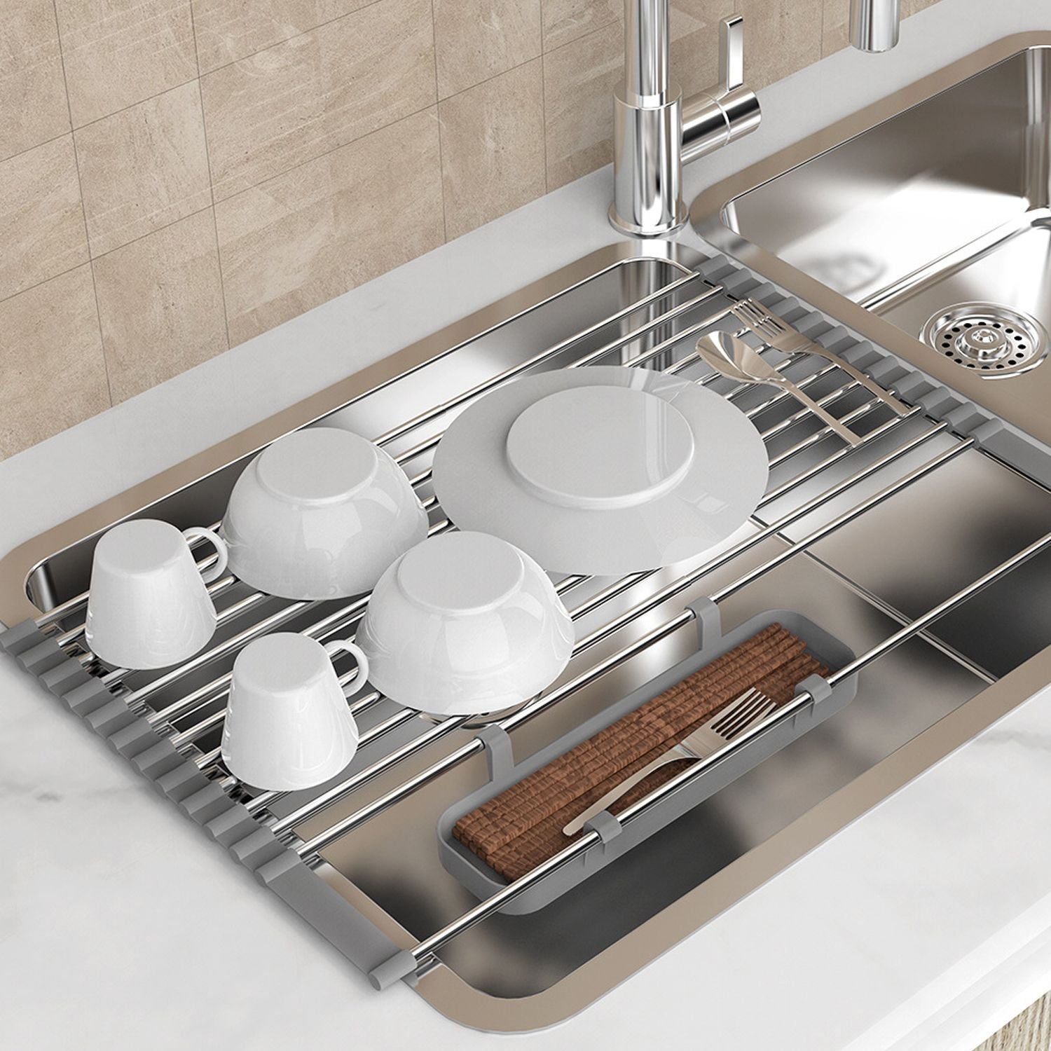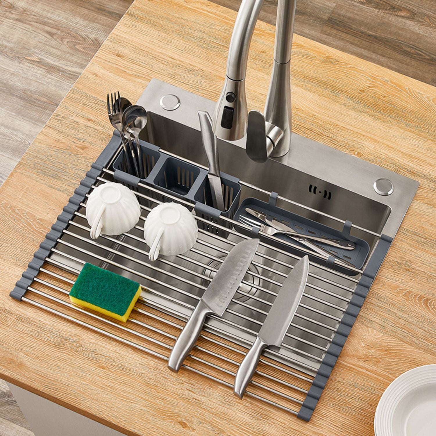 Ausziehbarer, aufrollbarer Geschirrtrockner mit 2 herausnehmbaren Körben, vielseitiger Küchenabtropfkorb, Ablagefach, Aufbewahrungsregal, Edelstahl, platzsparend, für die Spüle geeignet